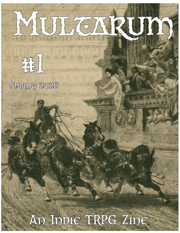Multarum means "many things" and this tabletop RPG zine will offer a variety of games in a compact and playable form. They are "idle designs": games focused on a specific vision of play, intended to create a complete and singular experience. The first number of Multarum showcases "A Worldbuilding Game" where you talk about your fantasy influences with your friends, come up with a game-world in response, and play in that world. "Arenas of the Old City" is quasi-historical fantasy where you play a troupe of gladiatorial entertainers putting on a show for the punters while the city makes its own demands on you.